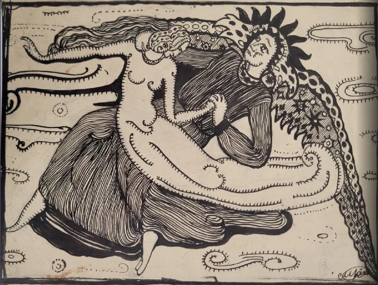 Pöördel: Kompositsioon lindudega. Eskiis. Pliiats